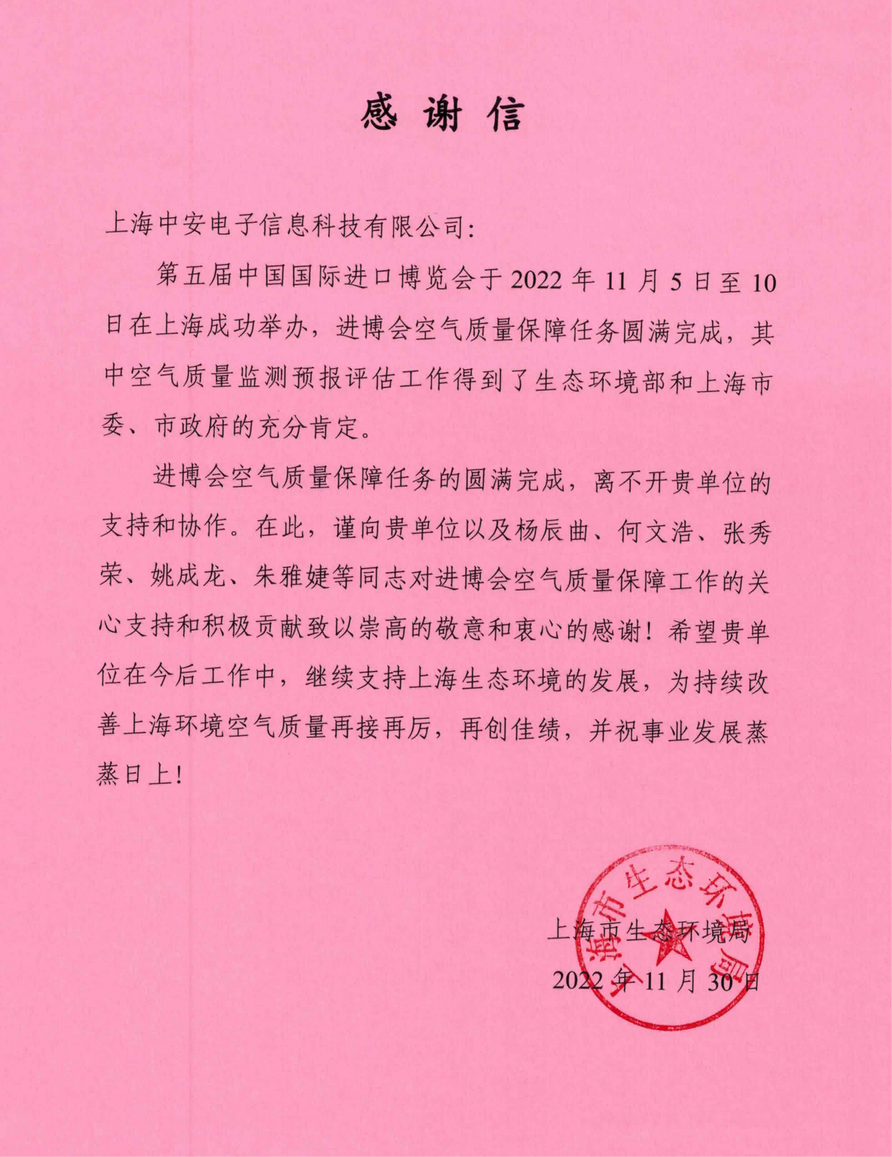 上海環(huán)監(jiān)中心就中安科技在21年國(guó)際進(jìn)博會(huì)空氣質(zhì)量監(jiān)測(cè)預(yù)報(bào)工作中杰出貢獻(xiàn)送來(lái)感謝信?。?021/12/31)